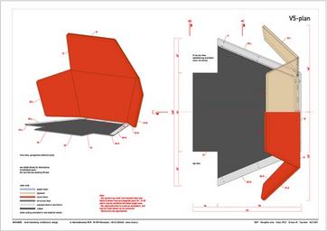 Backdrop screen for reception desk. Contains three sheets: - top and perspective view - sections - exploded isometric